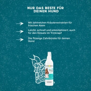 Das Zahnpflegespray Medidog Fresh & Clean macht die Zahnpflege bei deinem Hund ganz einfach und komfortabel für dich – mit einem bis zwei Pumpstößen, die du ihm pro Tag in die Lefzen sprühst. Das Spray zur Zahnpflege bei Hunden verteilt sich im ganzen Maul. Ideal als flüssige Zahnpaste in Kombination mit einer Hundezahnbürste oder einem Fingerling. Falls dein vierbeiniger Liebling das Sprühen suspekt findet, kannst du das Spray auch einfach in seinen Trinknapf geben.