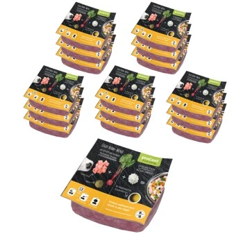 Ein paar Pfunde zu viel: Das kann Hunden ebenso wie Menschen passieren. Dieses Light-Menü unterstützt Deinen Vierbeiner beim Wiederfinden seines Idealgewichts. Das abgestimmte BARF-Menü versorgt ihn dabei mit allem, was er für eine ausgewogene Mahlzeit braucht und kann direkt in den Napf serviert werden. Hühnerfleisch ist bei viele Hunden sehr beliebt. Außerdem ist es mager, leicht verdaulich und eignet sich somit optimal als Diät-Futter für übergewichtige Hunde. Sein hoher Gehalt an Kalzium und Phosphor unterstützt die Knochenentwicklung und liefert das für den Muskelaufbau wichtige Magnesium. Das Frische-Menü wird ergänzt um Frischkäse und Rote Bete, die viel Vitamin B und Eisen enthält. Dadurch wird das Blutbild Ihres Hundes optimiert.